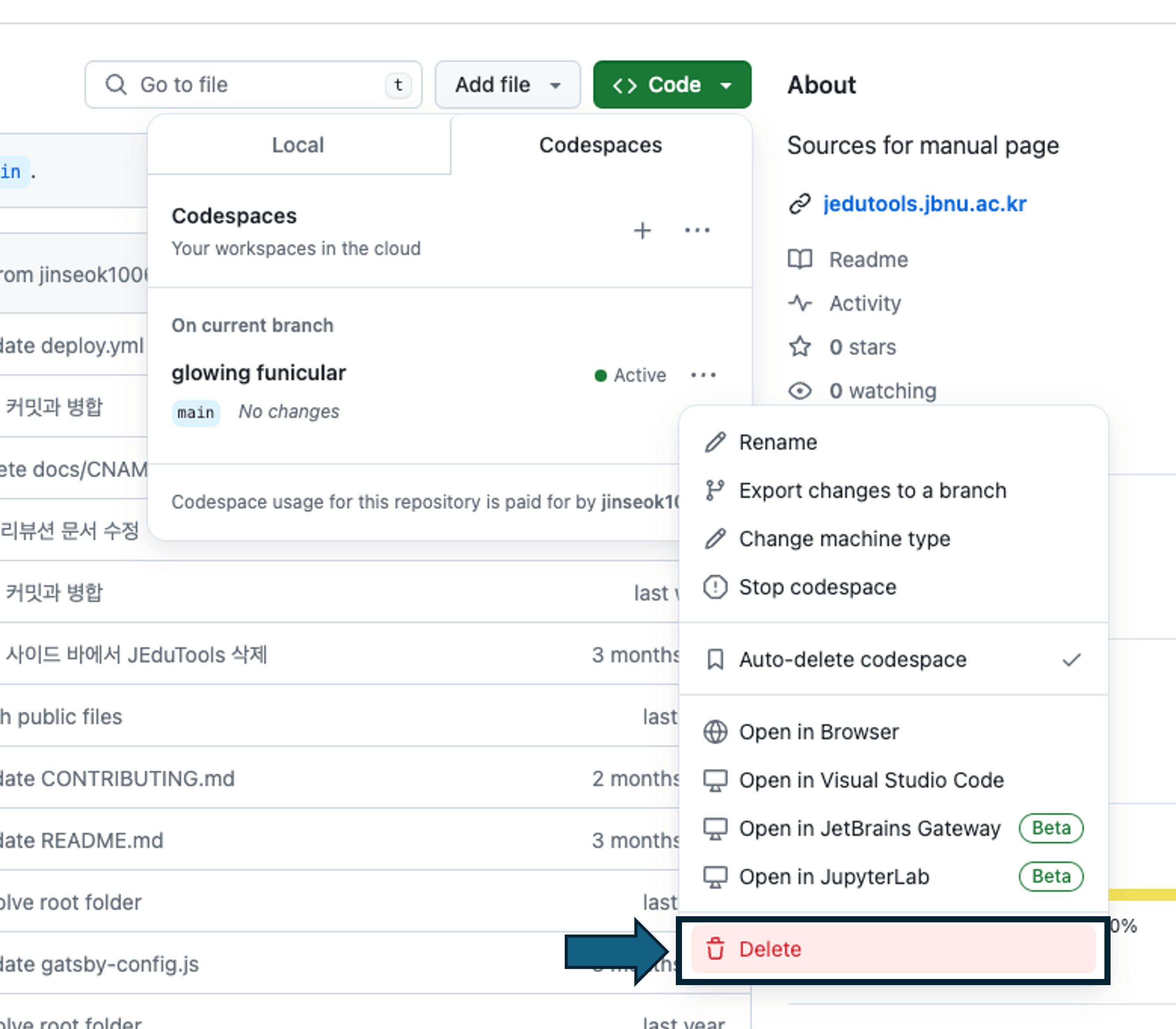 2.4) 개인계정에 할당된 codespace는 월별 사용량이 정해져 있으므로 작업을 완료한 이후에는 다음과 같이 codespace를 삭제합니다.