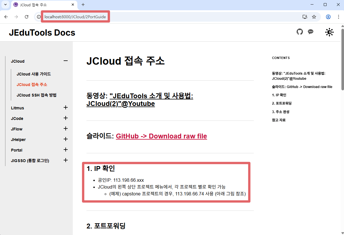 http://localhost:8000/JCloud/2PortGuide - 수정할 내용: 본문에 보이는