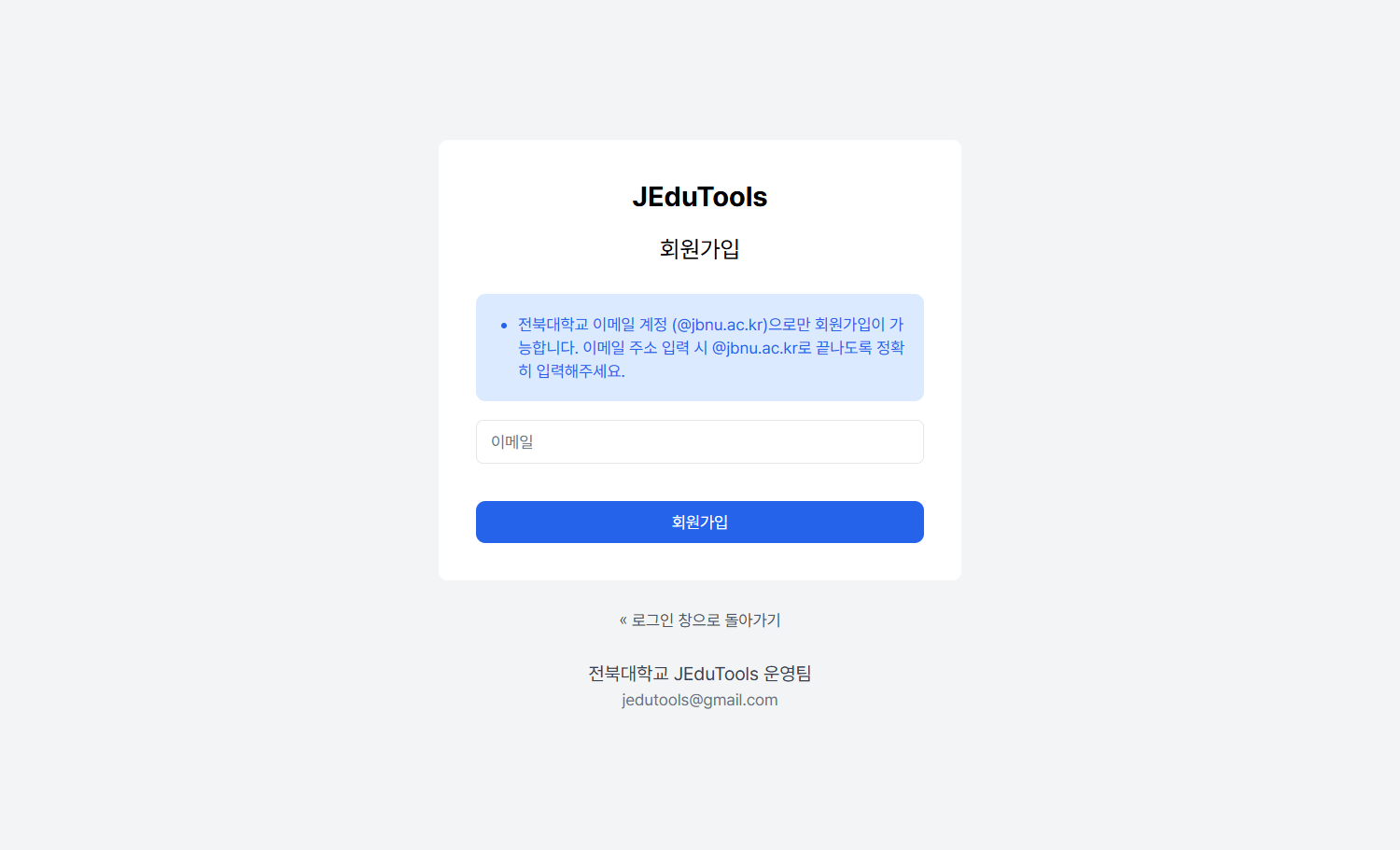 - JEduTools 서비스 회원가입: JEduTools 서비스에서 회원가입을 진행해주세요. 학교 메일(@jbnu.ac.kr)만 사용 가능하며, 메일 인증을 완료해야 합니다.
