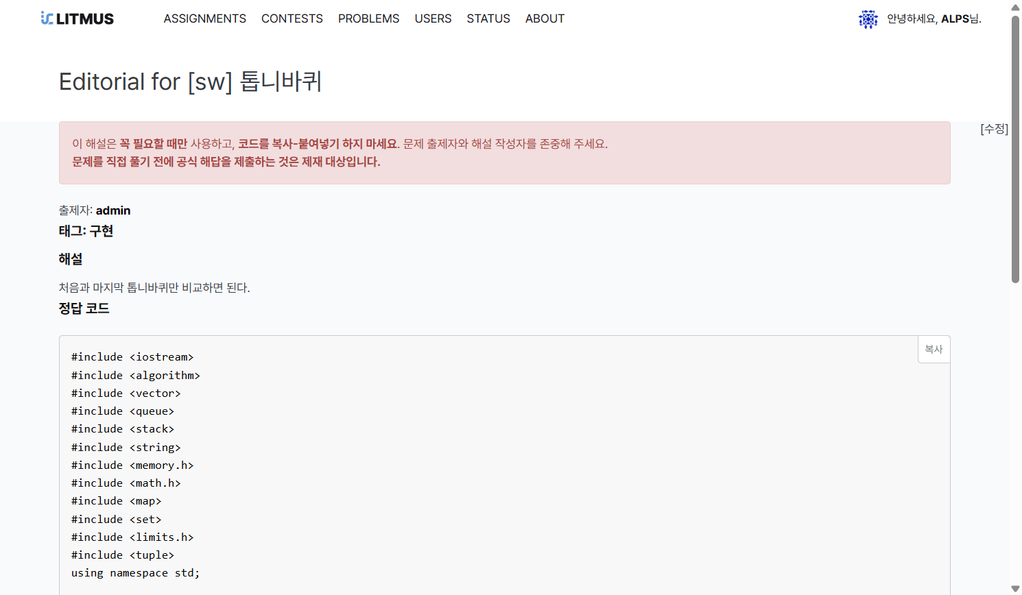 - 문제 해설: 문제 풀이에 대한 힌트, 태그, 정답 코드 등을 작성할 수 있습니다. 공개된 해설은 학생들이 확인할 수 있습니다.