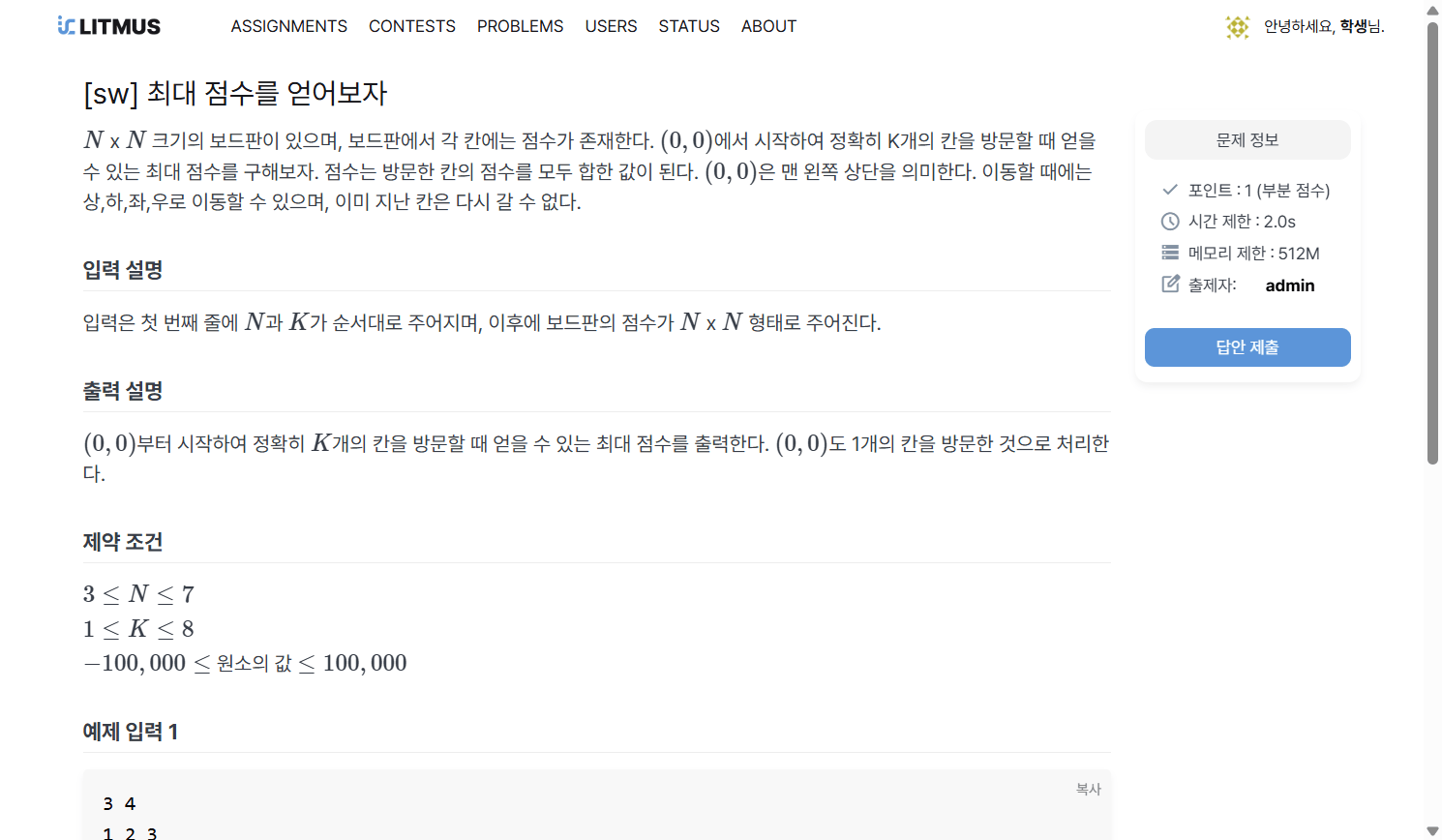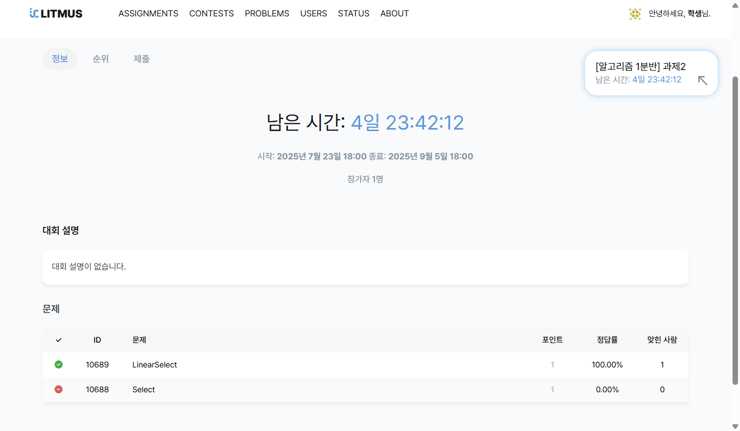 - 문제 목록: 참가 중인 과제/대회의 문제나 공개된 문제를 확인할 수 있습니다. 공개된 문제는 PROBLEM 탭에서 확인할 수 있습니다.