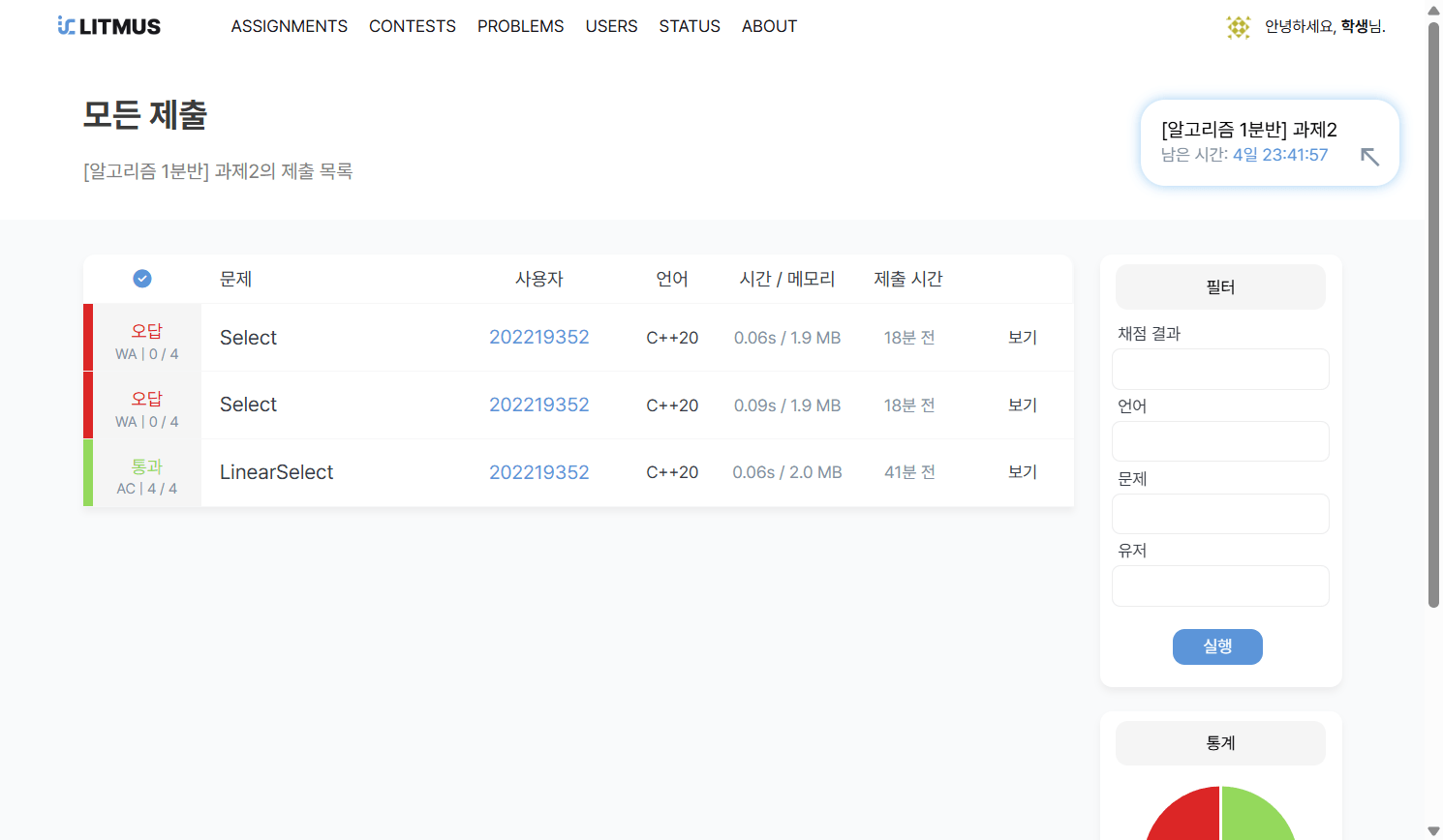 제출: 내가 제출한 코드들의 채점 결과를 확인할 수 있습니다.
